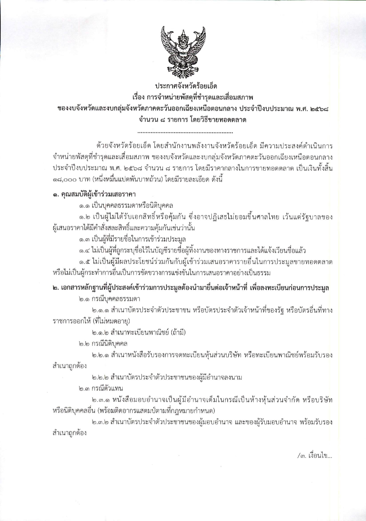 ของงบจังหวัดและงบกลุ่มจังหวัดภาคตะวันออกเฉียงเหนือตอนกลาง ประจำปีงบประมาณ พ.ศ. 2568จำนวน 8 รายการ โดยวิธีขายทอดตลาด